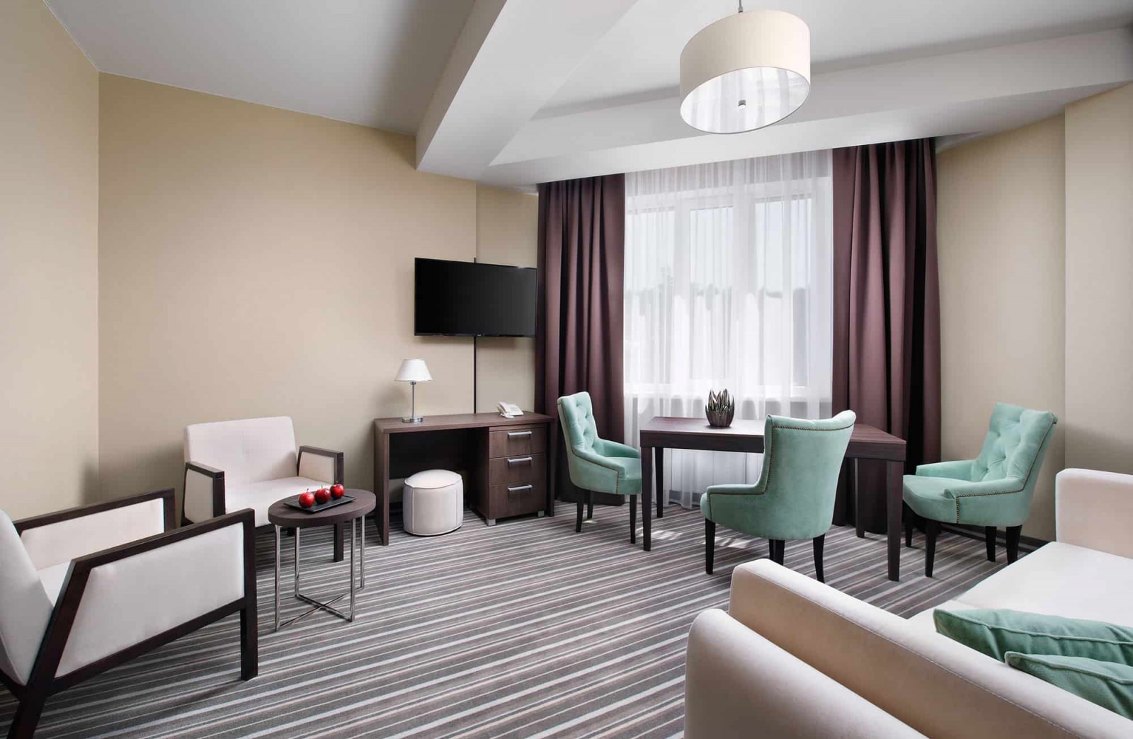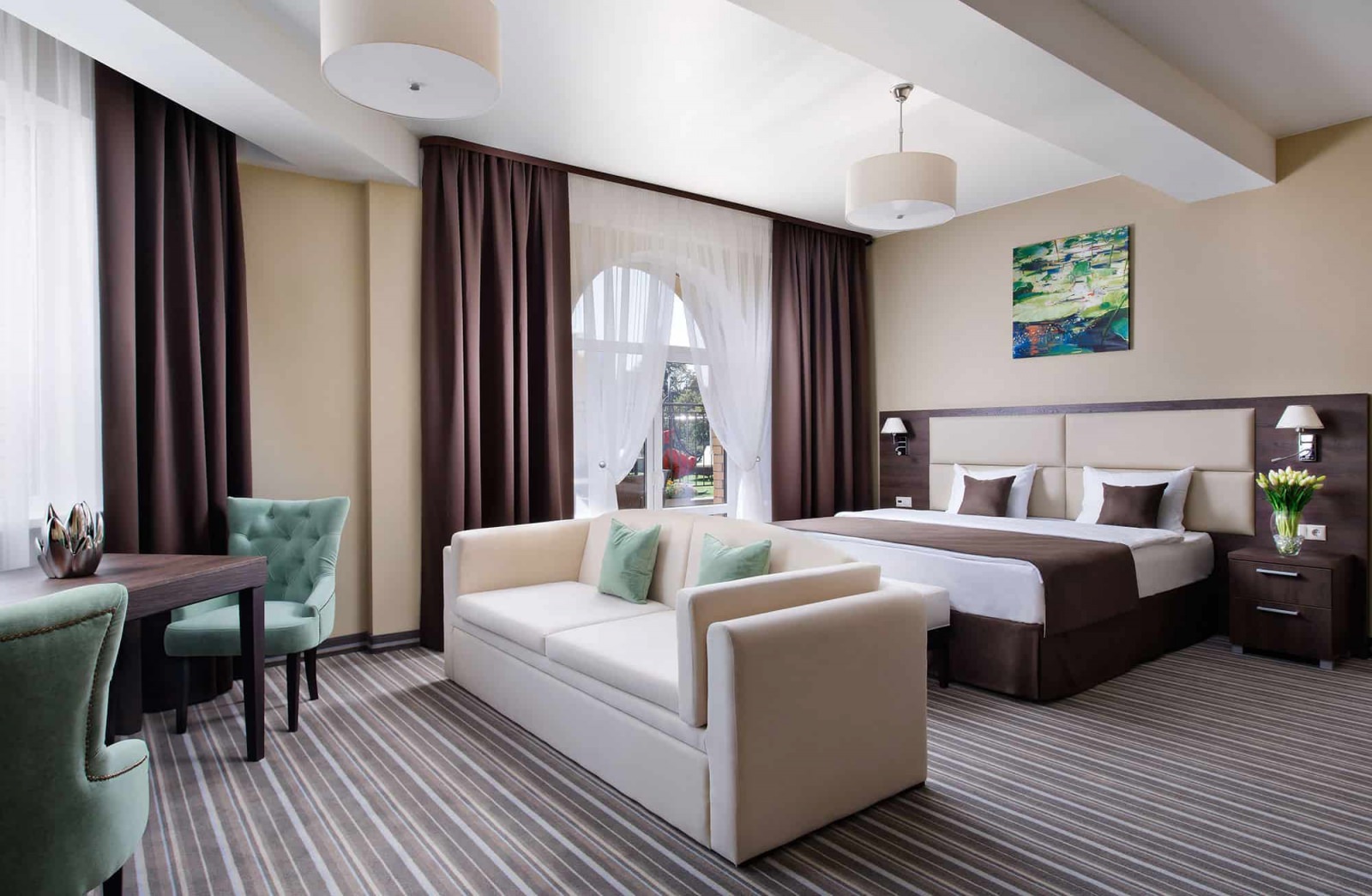 Номер оснащен телевизором, сейфом, двуспальной кроватью и диваном. Функционирует сплит-система, имеются микроволновая печь и холодильник.